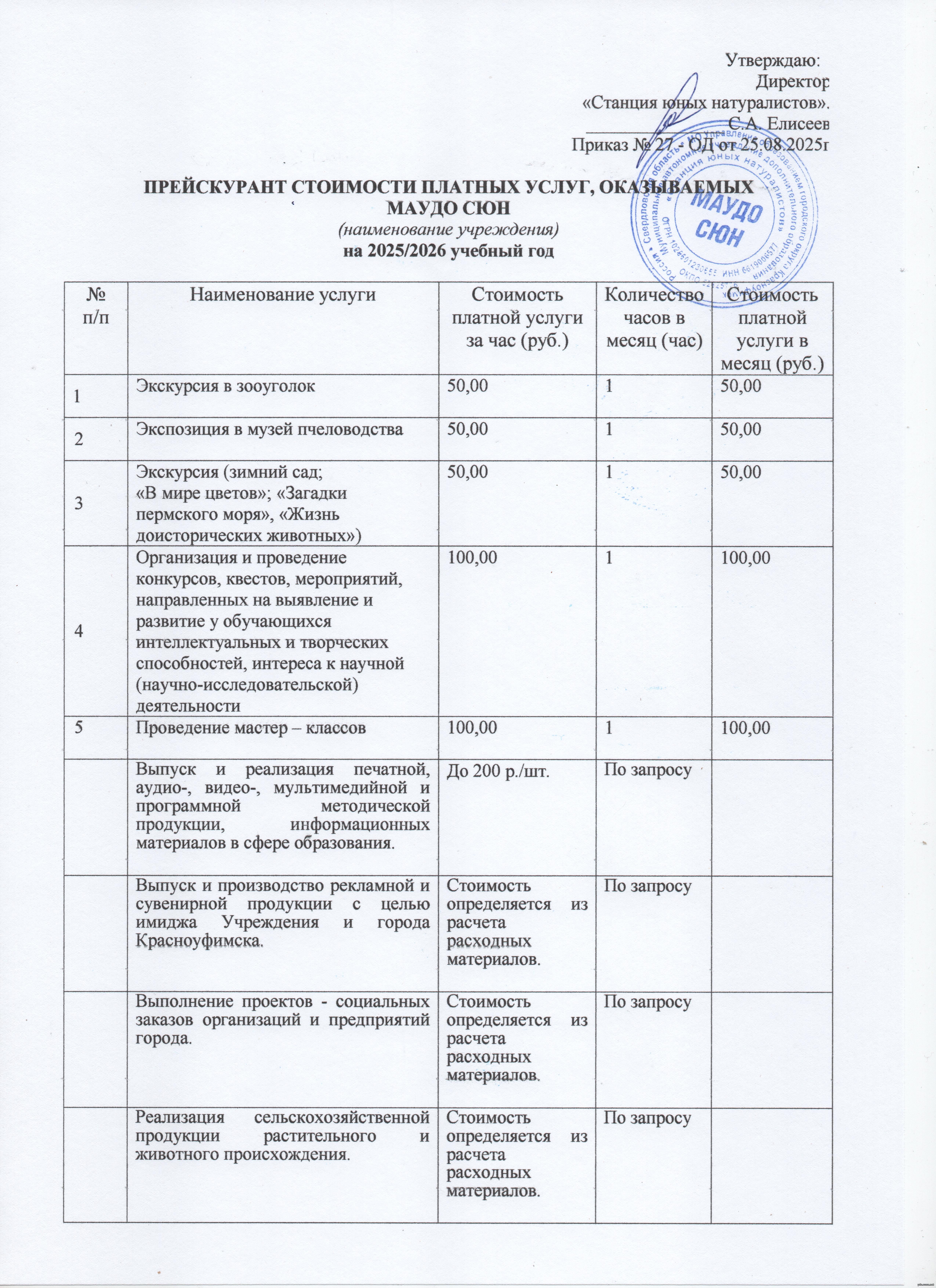 Перечень платных услуг, оказываемых МАУ ДО «Станция юных натуралистов» по видам деятельности не являющимися основными в 2025 г.
